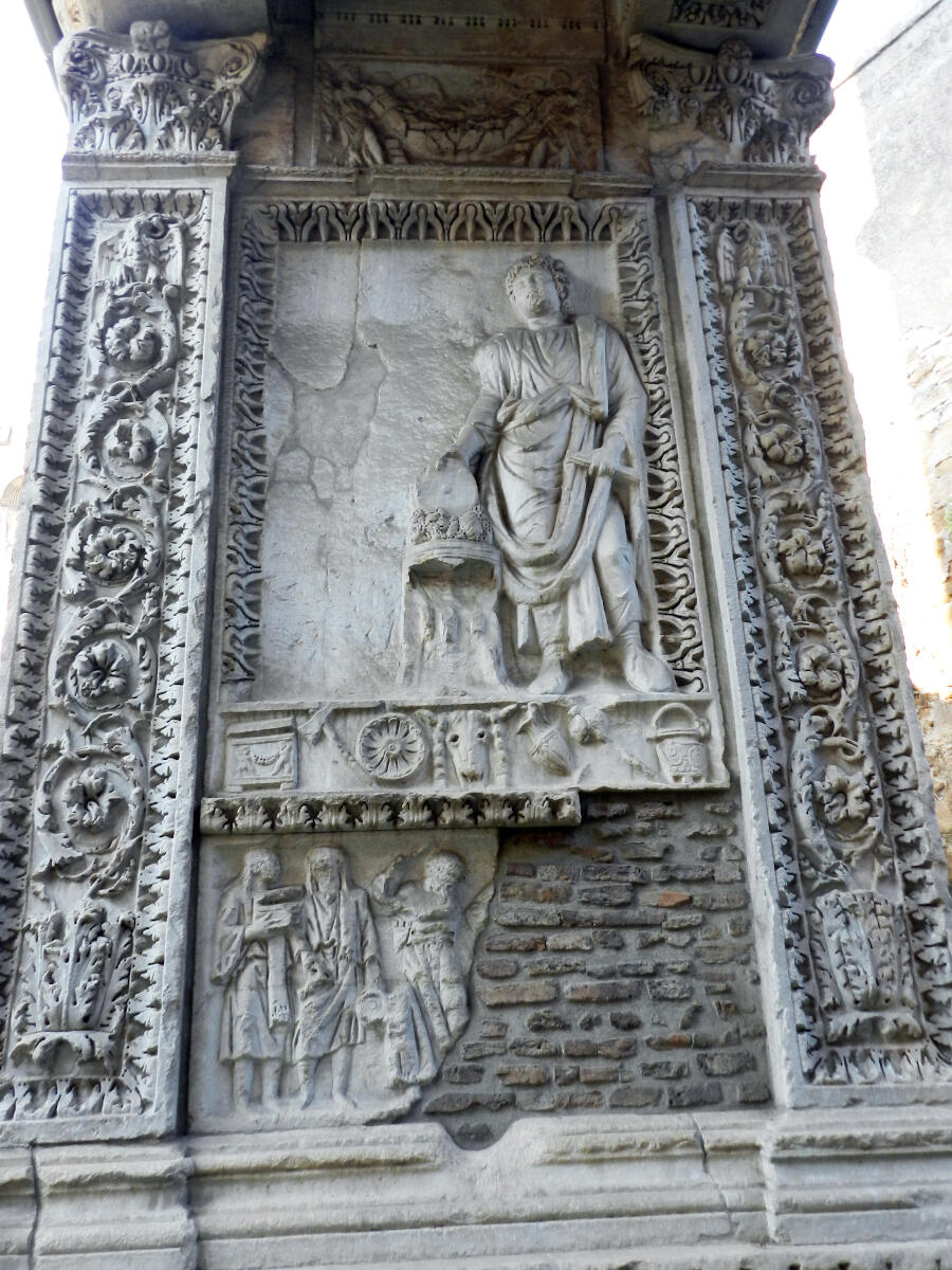On voit encore aujourd’hui, sur le panneau interne de cette construction, du côté oriental, le couple impérial sacrifiant. Septime Sévère et son épouse Julia Domna étaient à l’origine accompagnés de Géta, élevé au rang de César, mais son effigie fut bûchée, sur ordre de son frère, Caracalla, qui l’assassina (fin de l’année 211) et tenta d’en faire disparaître le souvenir (damnatio memoriae). Faisant face à ce relief,