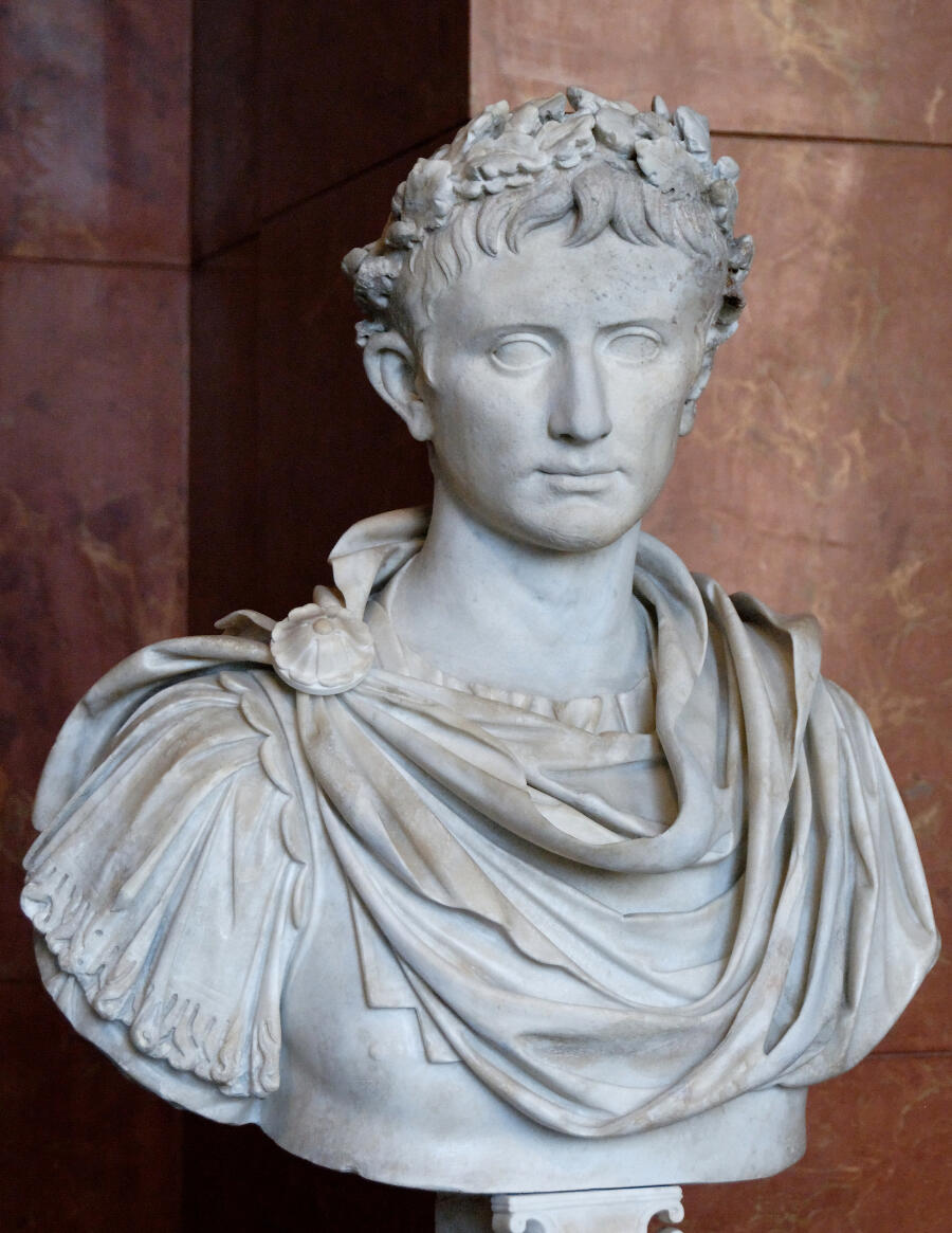 Petit-neveu de Jules César, Octave est le sauveur de la République et le fondateur de la dynastie des Julio-Claudiens. Le titre d’Auguste (épithète renvoyant à la sphère religieuse et qui l’élève au-dessus des autres hommes) lui fut décerné le 16 janvier 27 avant n. è. par le Sénat. Augustus devint rapidement son prénom et celui de tous ses successeurs.