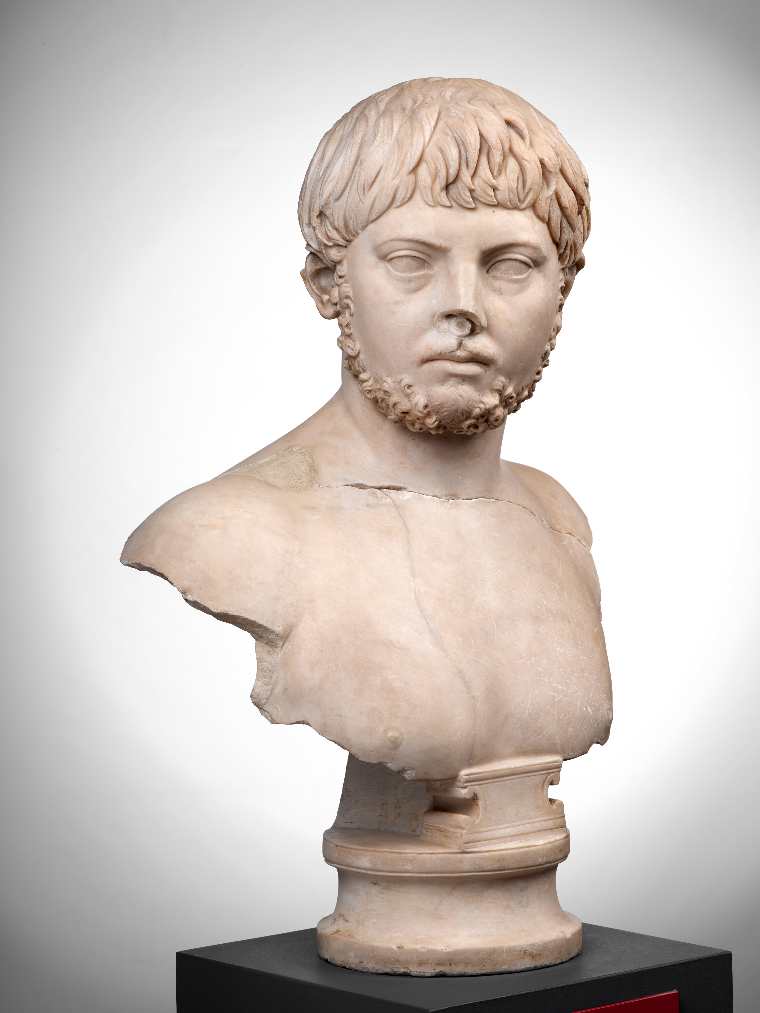 Le visage et la coiffure de ce jeune homme témoignent d’un certain « mimétisme » avec les premiers portraits d’Hadrien. Du reste, c’est le buste dans son ensemble qui correspond chronologiquement au début du règne d’Hadrien. Le piédouche (base) est dorénavant orné de volutes. Une mode apparaît : le port de la barbe. Le jeune homme la porte en collier, comme l’empereur Hadrien, dès son premier type iconographique. Ainsi peut-on rapprocher ce visage de l’un des portraits visibles sur l’arc de Bénévent, en Campanie, au niveau des parties hautes du monument, sur l’attique, où l’on reconnaît généralement Hadrien (les reliefs auraient été achevés après la mort de Trajan, au tout début du règne de son successeur).