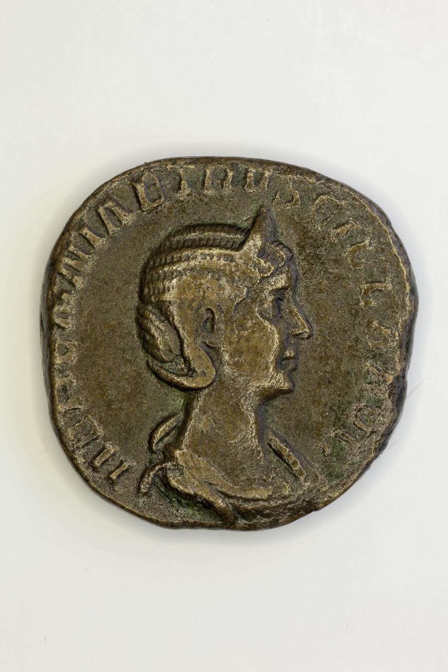 La tête pourrait être rapprochée d’un portrait conservé à Rome, au palais des Conservateurs (inv. 2689), qui semble représenter le même personnage, sans aucun doute membre de la famille impériale. Coiffure et profil se retrouvent sur les Sesterce d’Etruscilla, Rome 250, inv. 2000.23.508 musée Saint-Raymond Toulouse, Daniel Martin CC BY-SAmonnaies de l’impératrice Etruscilla, femme de Trajan Dèce (249-251), candidate aujourd’hui privilégiée pour ce portrait, au détriment de Salonine, épouse de Gallien, ou de Plautille, mariée à Caracalla, antérieurement proposées.