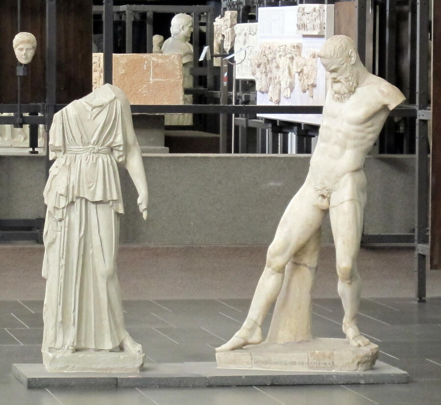 La grande sculpture d’Athéna découverte dans la villa de Chiragan est la reprise de l’une des œuvres connues, au moins par les sources écrites, de Myron d’Éleuthères, artiste actif dans les années 450/440 avant n. è. La déesse, originellement en bronze, était accompagnée d’une autre sculpture, conçue dans le même alliage, représentant un silène, du nom de Marsyas, compagnon du cortège de Dionysos, J. Boardman, Greek Sculpture. The Classical Period : A Handbook, London, 1985, fig. 61-64 ; K. Junker, « Die Athena-Marsyas-Gruppe des Myron auf der Akropolis von Athen », Jahrbuch des deutschen archäologischen Instituts, 117, 2002, p. 127‑183, en partic. p. 130-131, Pl. 1-6 et p. 138-139, Pl. 11-14.. Mi-homme, mi-animal, cet être hirsute, venu de Phrygie, région située au cœur de l’Asie Mineure, a été largement représenté dans l’art grec. Le groupe qu’il formait avec Athéna avait été conçu pour l’Acropole, site le plus hautement religieux d’Athènes. La mise en scène de ces deux êtres mythologiques trouvait peut-être son origine dans la représentation d’une œuvre théâtrale lyrique dédiée à Dionysos, un dithyrambe, écrit par un poète du Ve siècle avant n. è., Mélanippidès. Pausanias, écrivain grec du IIe siècle, décrit, six siècles après sa création, ce duo en bronze dont la notoriété fut telle que de nombreuses variantes furent conçues pour les plus beaux domaines de l’Empire à son époque Pausanias, Périégèse, 2nd century, I, 24, 1..
