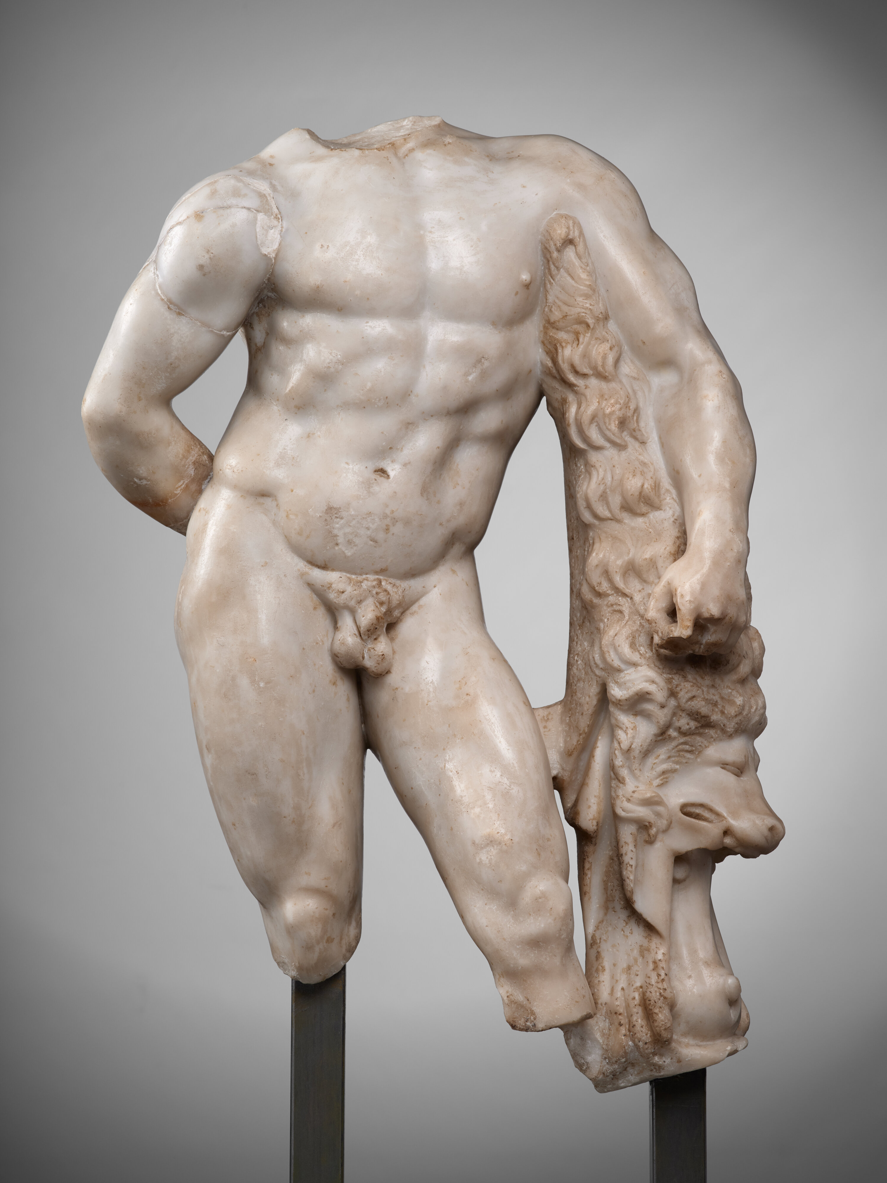 Les variantes romaines, en raison de quelques modifications sensibles, brouillent un peu la vision de ce que dut être, réellement, l’original grec. La version découverte dans la villa de Chiragan, pourrait bien correspondre au deuxième des trois types distingués par P. Moreno P. Moreno, Lisippo : l’arte e la fortuna. Mostra, Palazzo delle esposizioni, Roma, 1995, Milan, 1995, p. 242-250. : la peau de lion prend peut-être ici plus d’importance, l’inclinaison de la tête, malheureusement disparue dans le cas de notre exemplaire, serait plus prononcée que sur d’autres types et la masse musculaire moins outrancière qu’à Naples ou Florence (Palais Pitti) où, à la différence de la variante de Chiragan, la jambe gauche vient en avant de la droite, les pieds s’alignant ainsi. La seule position de la jambe droite, écartée, du marbre toulousain, rapproche donc bien plus ce dernier de l’Héraclès au repos, découvert à Foligno et conservé au musée du Louvre.