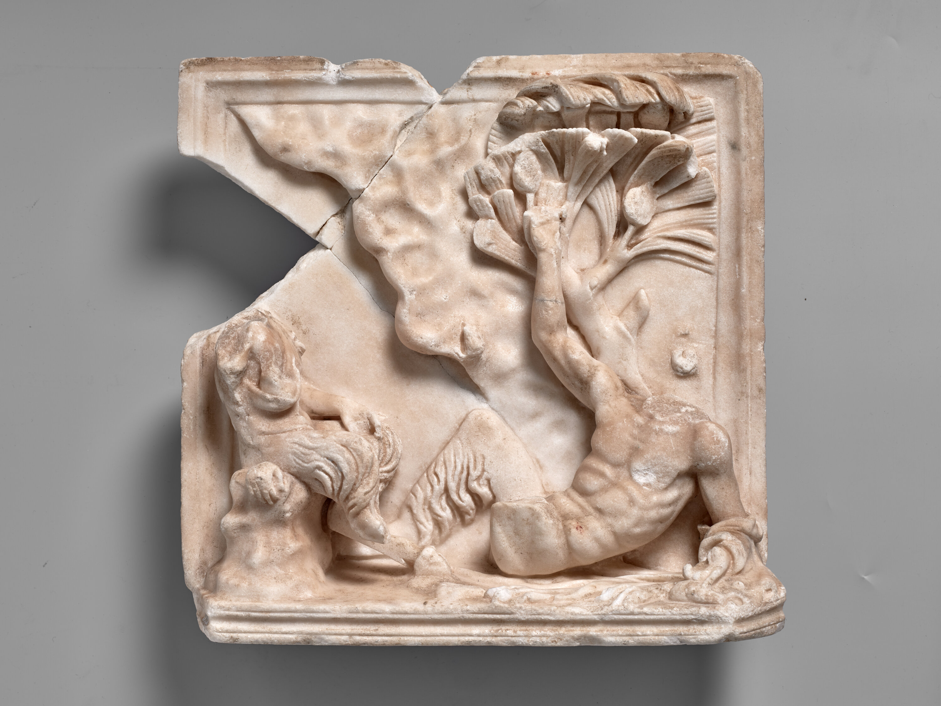 Outre le tableau de l’enlèvement de Perséphone, qui correspond à une catégorie d’œuvre très rare, un second pinax de marbre provient, lui aussi, de la villa. Il représente deux satyres, masculin et féminin, reconnaissables, au premier regard, à leurs pattes de boucs. La scène se déroule devant une grotte, au pied d’un pin pinier (pinus pinea) ou pin parasol. La créature de droite, couchée, prend appui sur son bras gauche, autour duquel est enroulée la pardalide (peau de panthère). Il tend le bras en direction de l’une des trois pommes de pin (strobilos) visibles dans l’arbre. Le satyre féminin lui fait face ; plus petite, elle est assise sur un rocher, le corps enveloppé dans sa peau de bouc, dont l’une des pattes retombe au-devant de l’épaule gauche. Les créatures sont malheureusement acéphales. Ne reste que la trace d’un tenon, à droite, vestige de la liaison de la tête de la créature couchée avec la surface du tableautin. À ces décapitations, s’ajoutent d’autres lacunes : jambe gauche du satyre ou encore bras et jambe du côté droit de la satyresse, également brisés. Enfin, comparant ce relief au tableau montrant Hadès et Perséphone, on constate ici quelques maladresses de proportions et peut-être une plus grande hâte dans l’exécution.