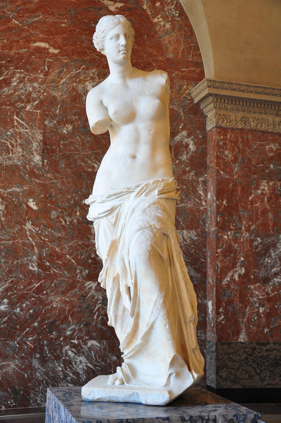 de Milo, références suprêmes en cette première moitié du XIXe siècle néo-classique. Exposée à Paris en 1867, elle fut attribuée au grec Praxitèle F. Pagès, « La Vénus de Martres », Revue archéologique du Midi de la France, 2, 1867, p. 50‑52. avant de devenir, plus raisonnablement, l’une des répliques de l’Aphrodite de Cnide, ville côtière de Carie (sud-ouest de l’actuelle Turquie). Si l’œuvre originale, créée vers 360 avant n. è., a disparu, elle fut amplement copiée. Sa réputation doit beaucoup au témoignage de Pline l’Ancien, qui écrit, au sujet du sculpteur : « Sa Vénus est à la tête, je ne dis pas seulement de toute sa production, mais de celle de tous les artistes du monde » Pline l’Ancien, Histoire naturelle, 77 (circa), XXXVI, 20.. Le même Pline rapporte que s’il avait été donné à Praxitèle la possibilité de privilégier l’une de ses œuvres, l’artiste aurait sans hésitation porté son choix sur celles qui avaient été peintes par Nicias. Ce dernier était effectivement passé maître dans l’application de couleurs sur le marbre poli des sculptures, en premier lieu celles de son confrère Praxitèle.