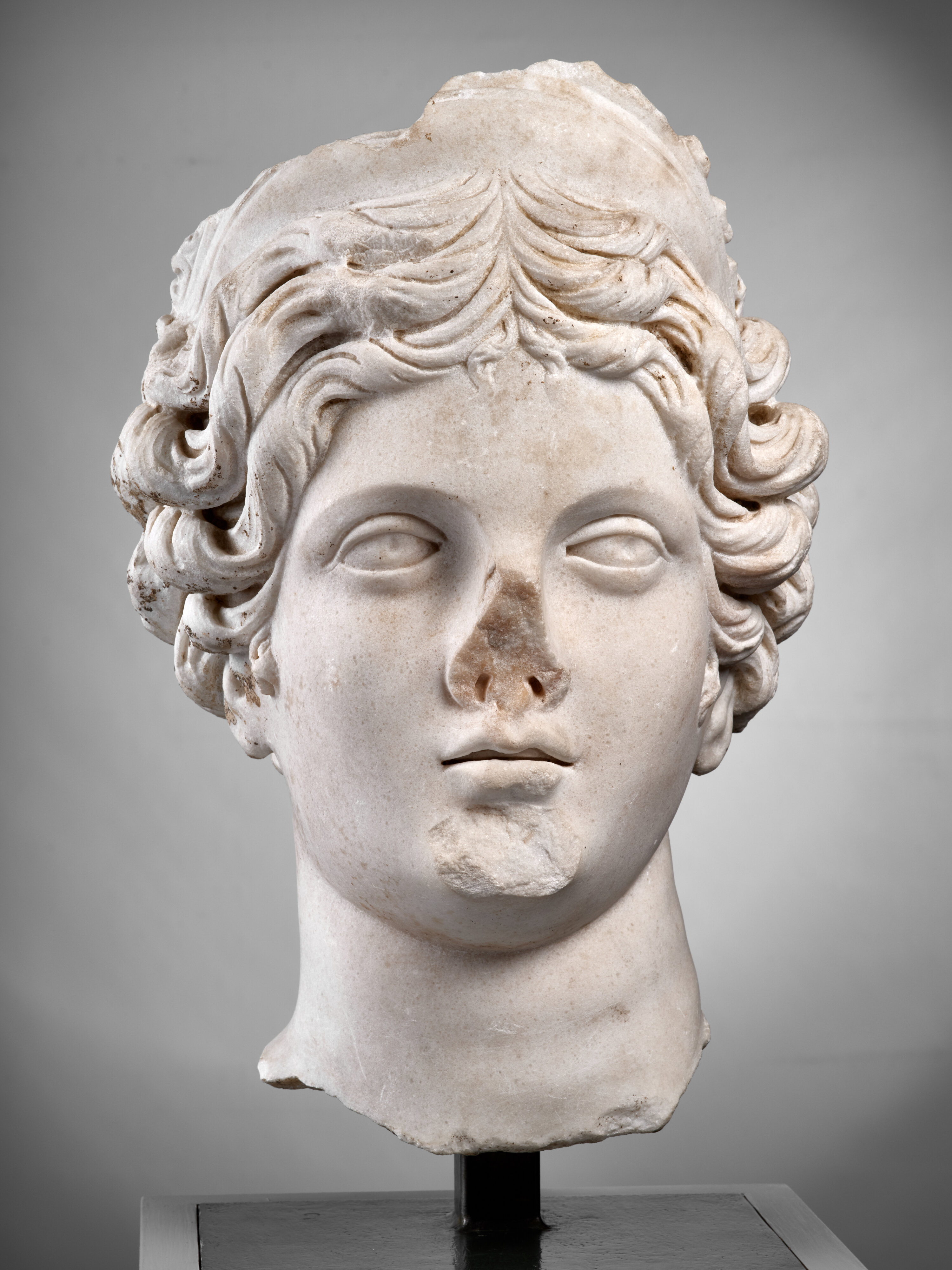 Cette tête féminine pourrait représenter Vénus (l’Aphrodite grecque), déesse du charme, de l’envoûtement et de l’amour. L’attachement particulier qu’entretint Rome à son encontre est intimement lié à son statut de mère d’Enée, ancêtre mythique du peuple romain.