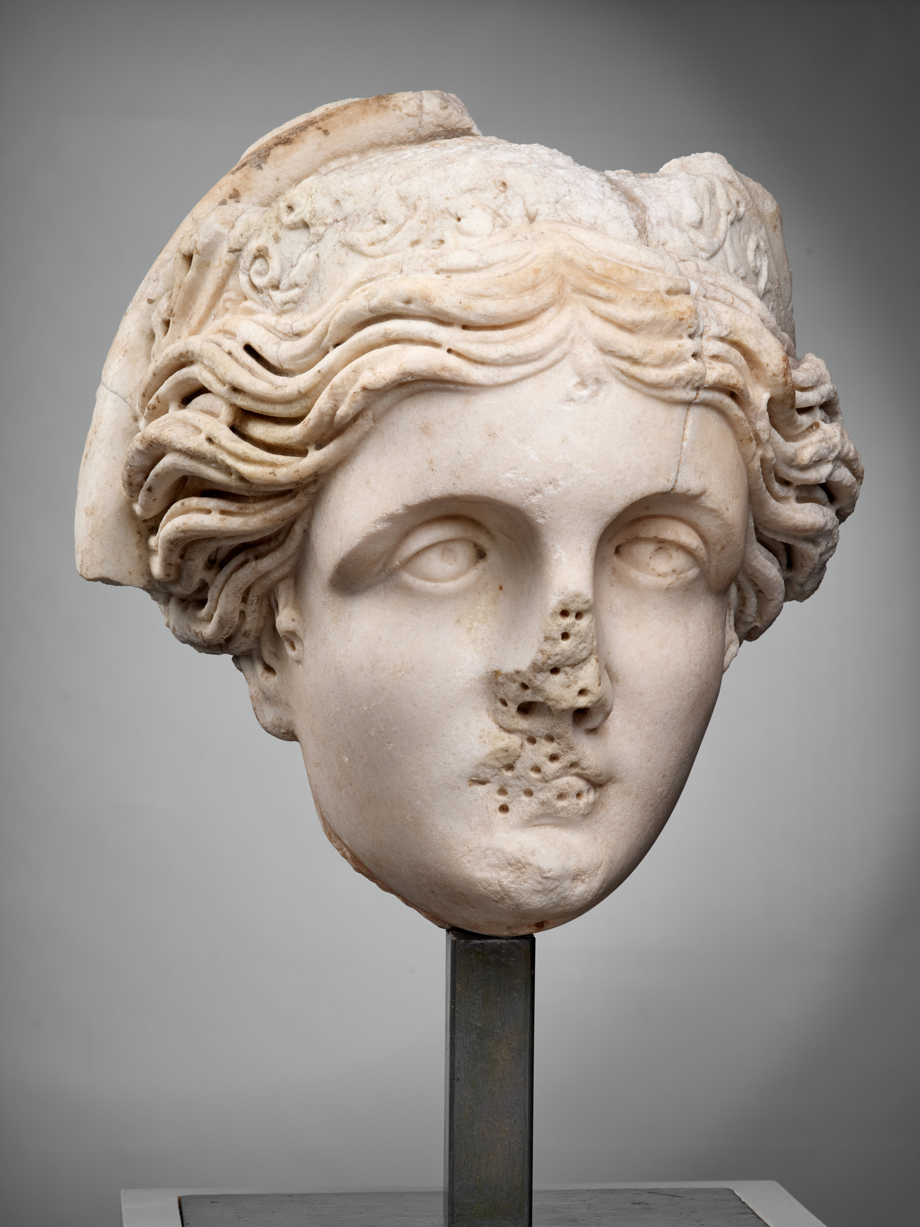 Les trous, particulièrement indignes, qui parsèment le nez et les lèvres, rappellent le travail des restaurateurs du XIXe siècle, qui n’ont pas hésité à entailler certaines parties des œuvres afin de mieux y fixer les compléments en plâtre (généralement le nez, les oreilles ou le menton). Ces ajouts furent retirés au cours du siècle dernier, laissant apparaître creusements et orifices des goujons, au détriment de l’esthétique de la sculpture.